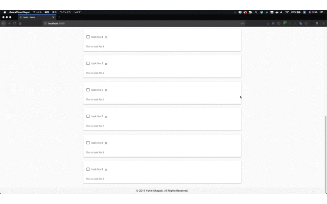 バリデーションを追加したり、ドラッグ・アンド・ドロップで並び替えられるようにしたり、ユーザのログイン/ログアウト機能を付けたりとまだまだ実装の余地はありますのでぜひチャレンジしてみてください。