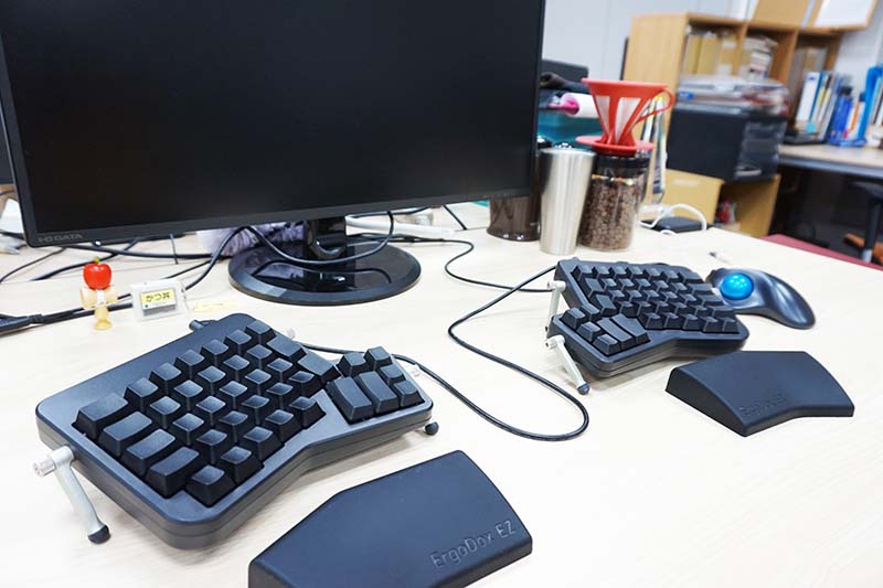 特にキーボードにこだわりがあったわけではなく、体格的に肩幅が広く、以前からMacBookのキーボードを使用していると、肩に負担がかかるのを感じていました。風の噂でセパレートキーボードを知り、技術評価制度で表彰されて軍資金を得たので、少しお高めのErgoを購入しました。