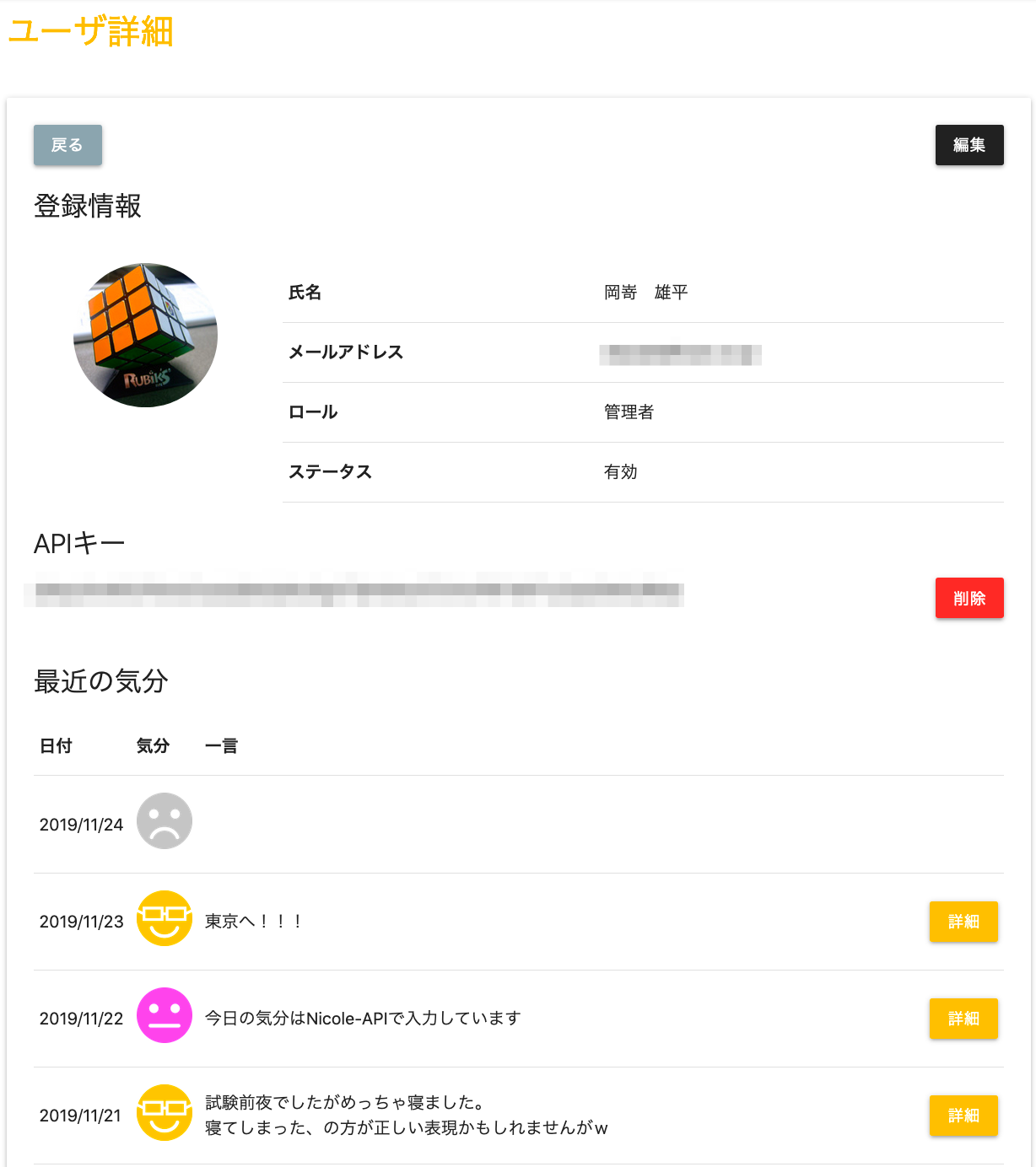 APIも公開しているので、APIキーの発行もできるようにしています。(社内システムなので簡易認証です)