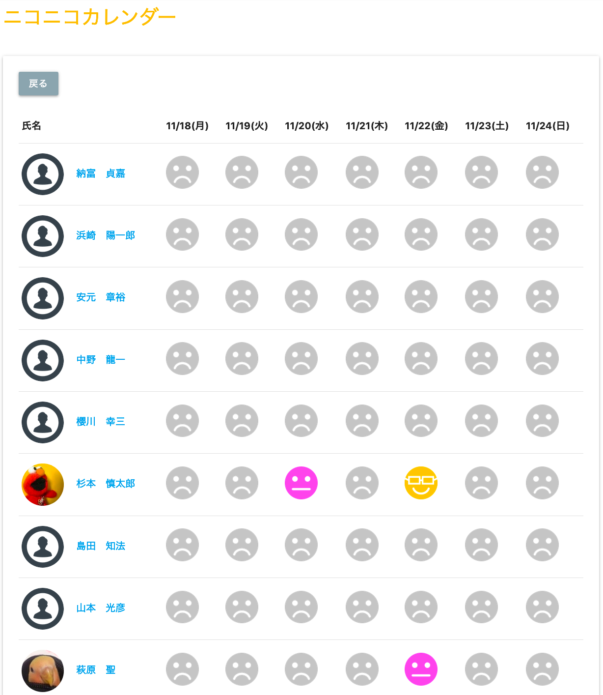ニコニコカレンダーカレンダー画面では、直近1週間の全社員の気分を閲覧できます。