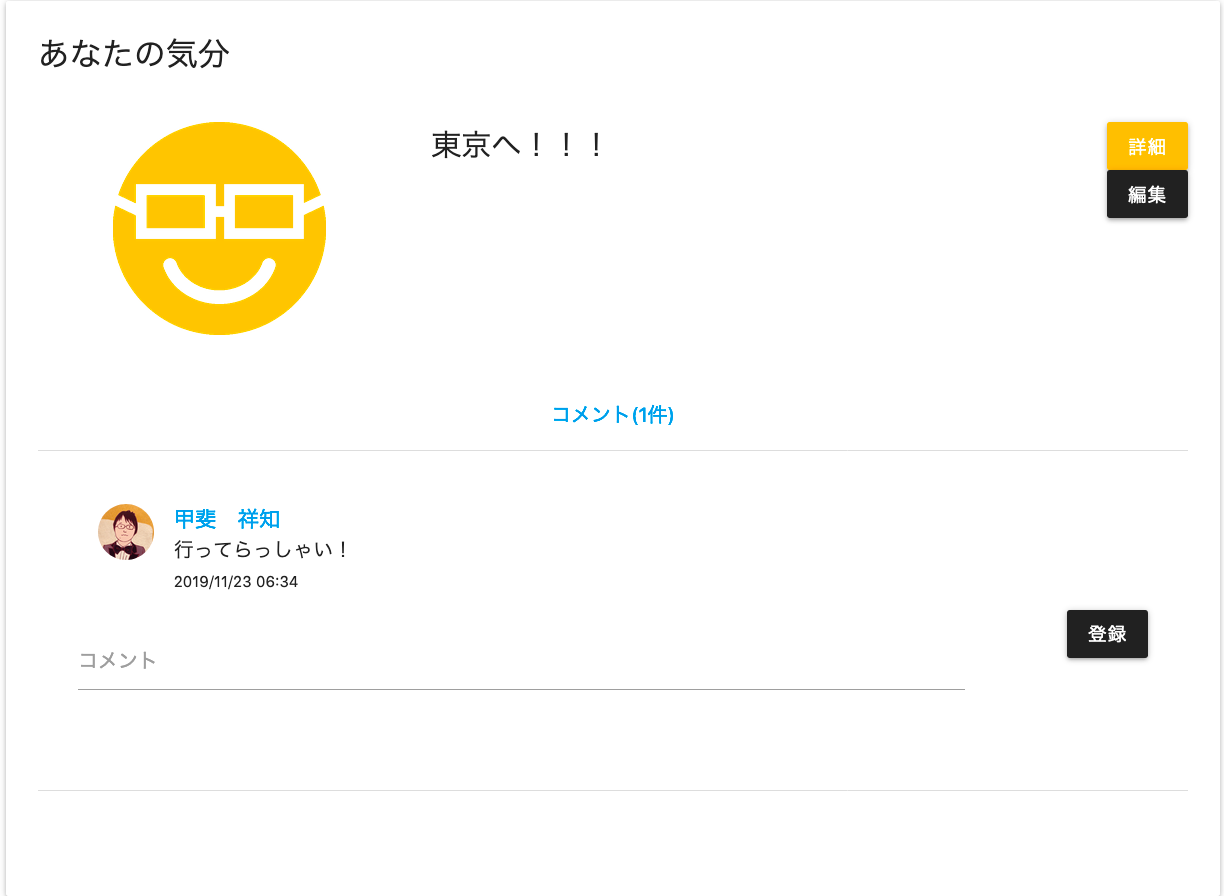 気分は「良い」「普通」「悪い」の3択とし、気分に加えて1日一言をつぶやけるようにしています。つぶやきには他社員からコメントもできるようになっています。