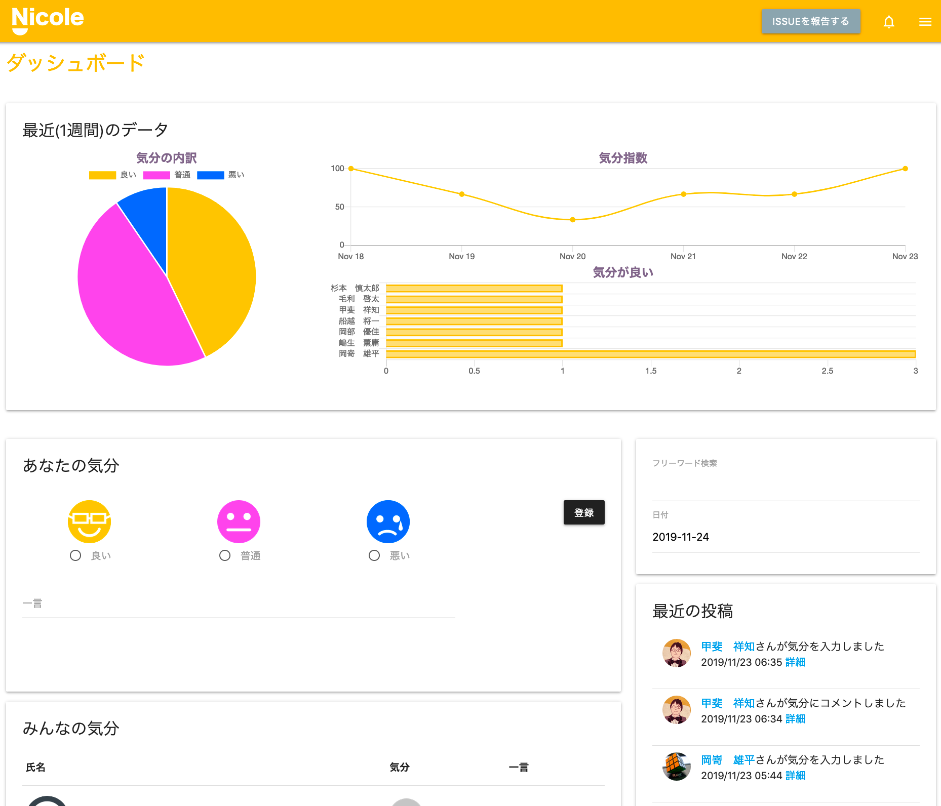 完全に思いつきで作ったシステムではありますが、既に何人かの社員が使ってくれていて開発者としては喜ばしく感じています。徐々にですが、他の社員が何を考えているのか、気分が良いのか悪いのかが見えるようになりつつあります。