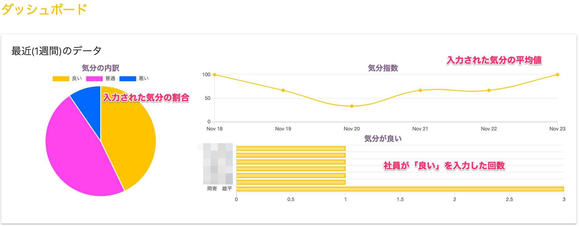 ダッシュボードの下部にスクロールすると、全社員の当日の気分を閲覧することができます。