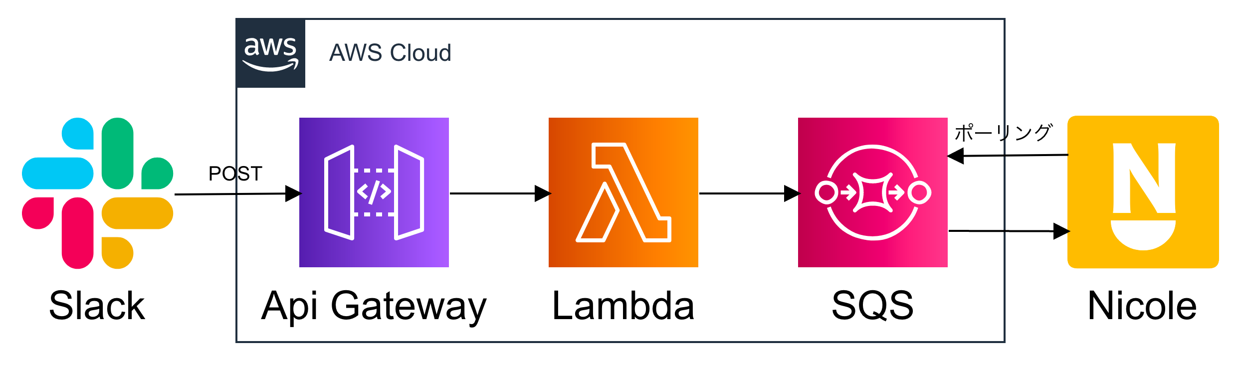 Nicoleは社内システムのためIP制限がかかっており、エンドポイントを作ってもSlackからアクセスができません。 このため、AWS SAMで作ったエンドポイント(Api Gateway)→Lambda→SQSという順番でデータを流し、Nicole側からSQSをポーリングしています。