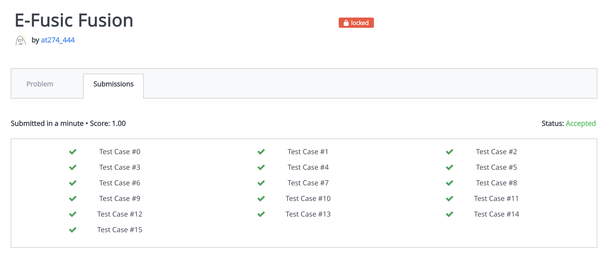 急ではありますが、E問題をACするための延長戦が始まりました。 Fusic20の信条の一つ、『諦めが悪い』を見事に体現していますね。作問者としても嬉しい限りです。
