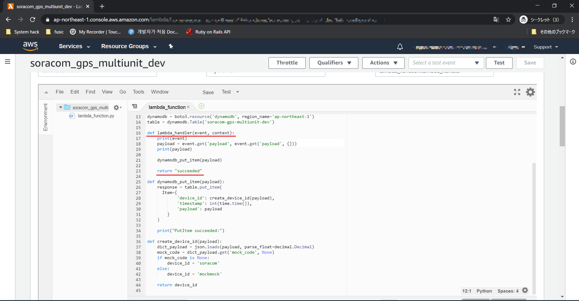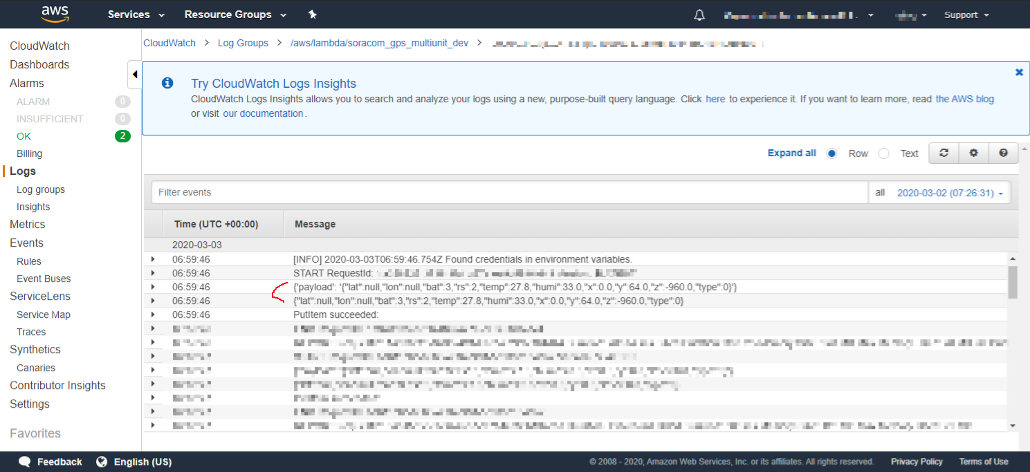 print(event)とprint(payload)でSORACOM Funkから送られたデータGPS マルチユニットのセンサーデータを確認したら、