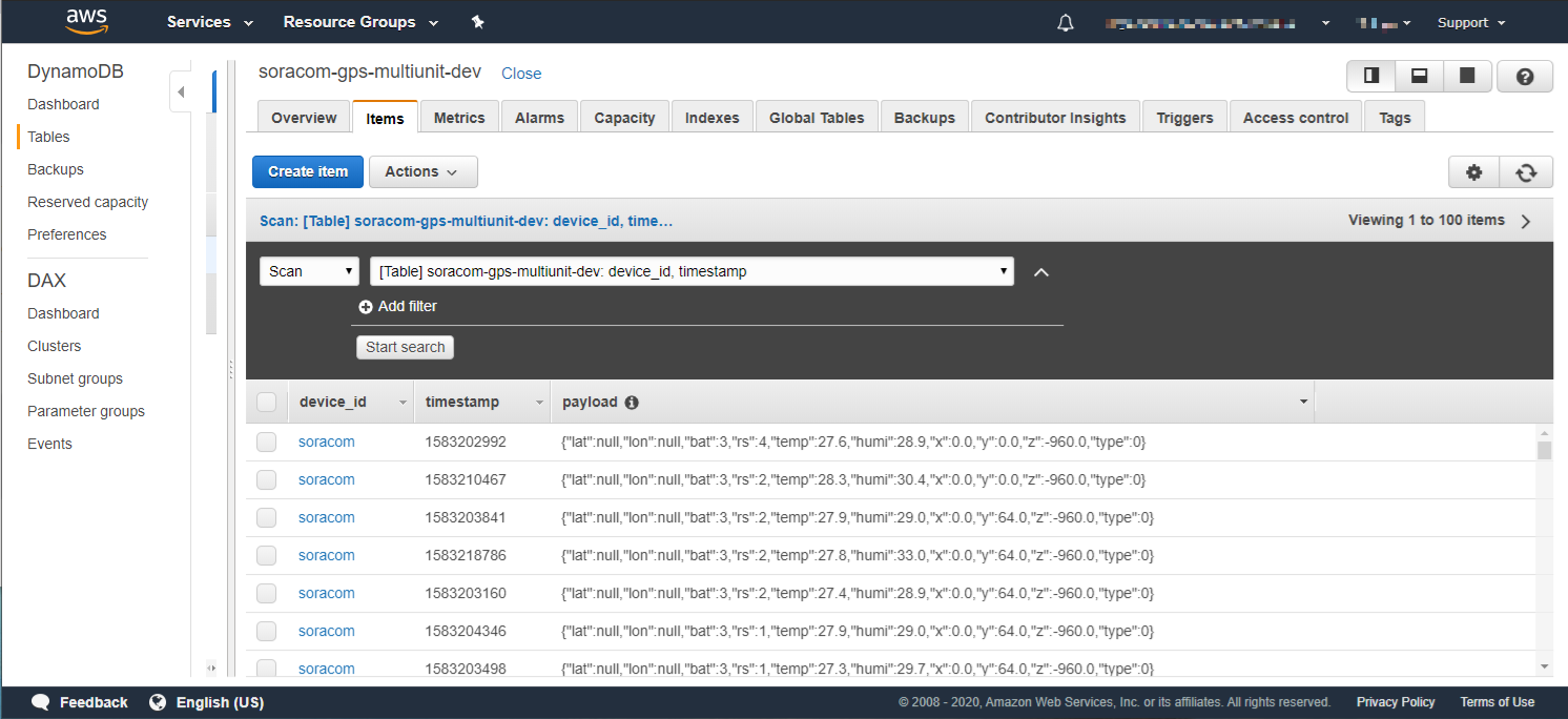 AWS DynamoDBでGPS マルチユニットのセンサーデータ保存を確認