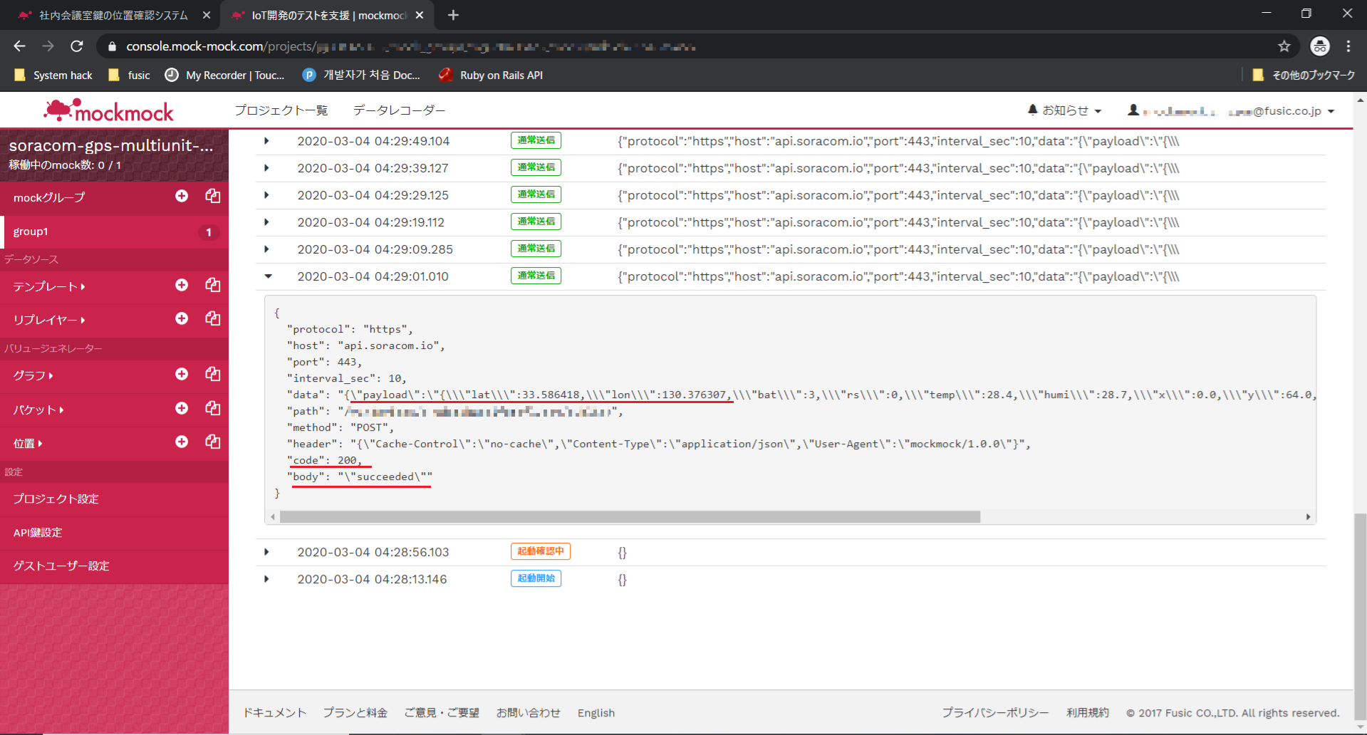mockの送信に対するレスポンスがsucceededになってます。これはSORACOM Funkと連携しているAWS Lambdaが返している値です。