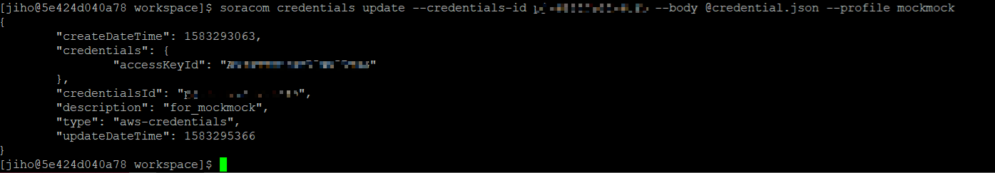 soracom credentials update --credentials-id <SORACOM認証情報ID> --body @credential.json --profile mockmock