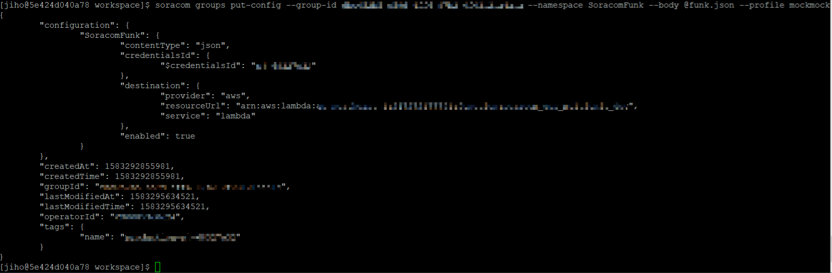 soracom groups put-config --group-id <デバイスグループID> --namespace SoracomFunk --body @funk.json --profile mockmock