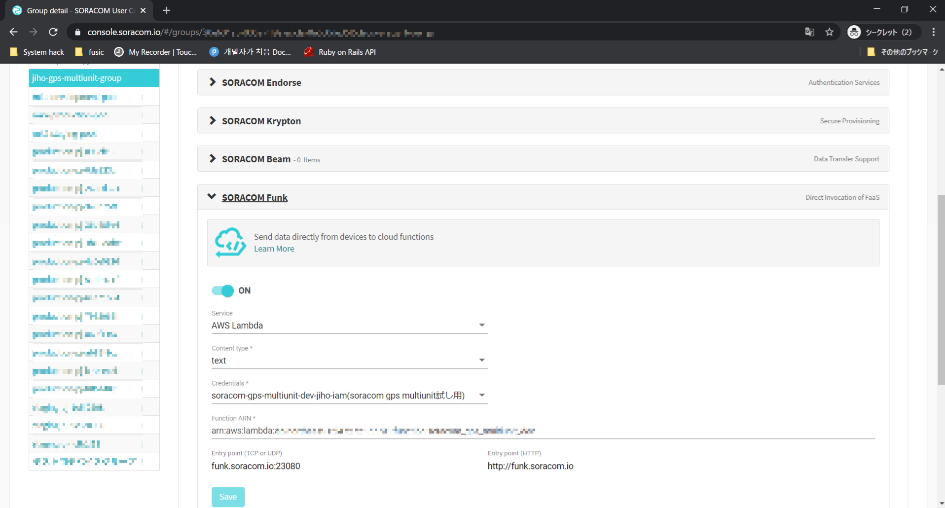 SORACOM Harvest、SORACOM Lagoon、SORACOM Beam、SORACOM Funnelだけ書かれてますが、SORACOM Funkも使用可能でした - https://dev.soracom.io/jp/start/funk_aws_lambda/ でFunkの設定部分を主に参考しました
