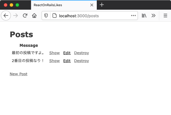 http://localhost:3000/posts にアクセスすると投稿されたメッセージの一覧が表示されます。