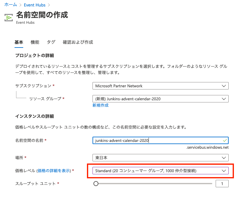 通常のEvent Hubsの作成と特に何も変わりません。 価格レベルをStandardレベルにすると、Kafkaエンドポイントが自動的に有効になります。