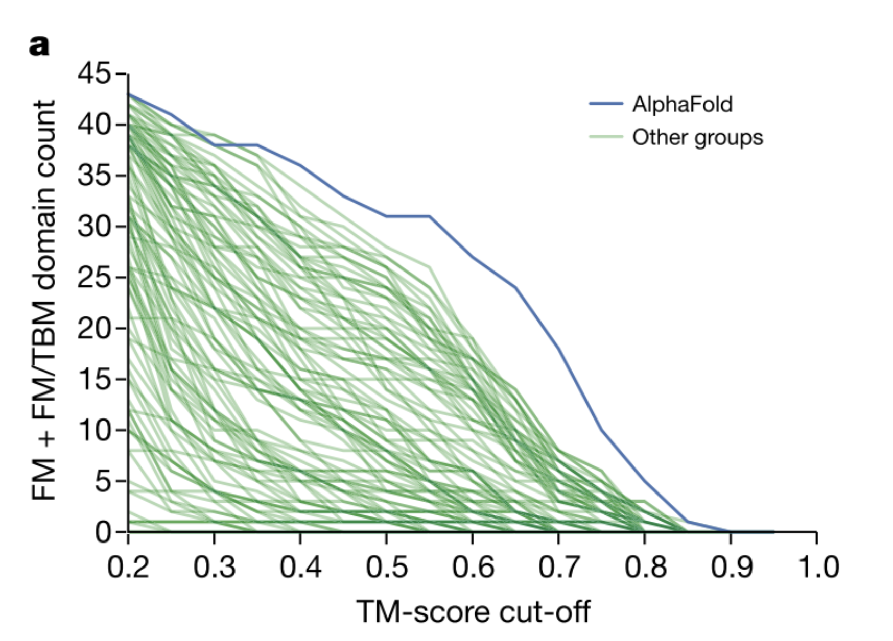 上の図.1aは、AlphaFoldが他のどのシステムよりも高い精度でより多くのFMドメインを予測していることを示しており、特に0.6〜0.7のTMスコア範囲では、より多くのFMドメインを予測していることを示していますね。FMドメインということは、ヒントがない(相同構造が得られない)状態なのにスコアが高いなんてすごい!