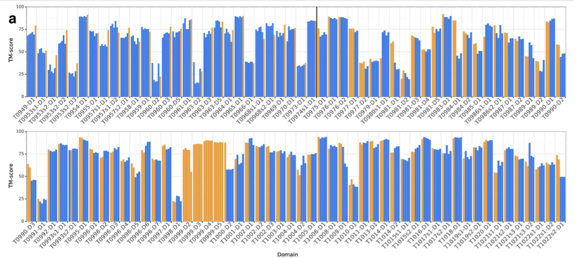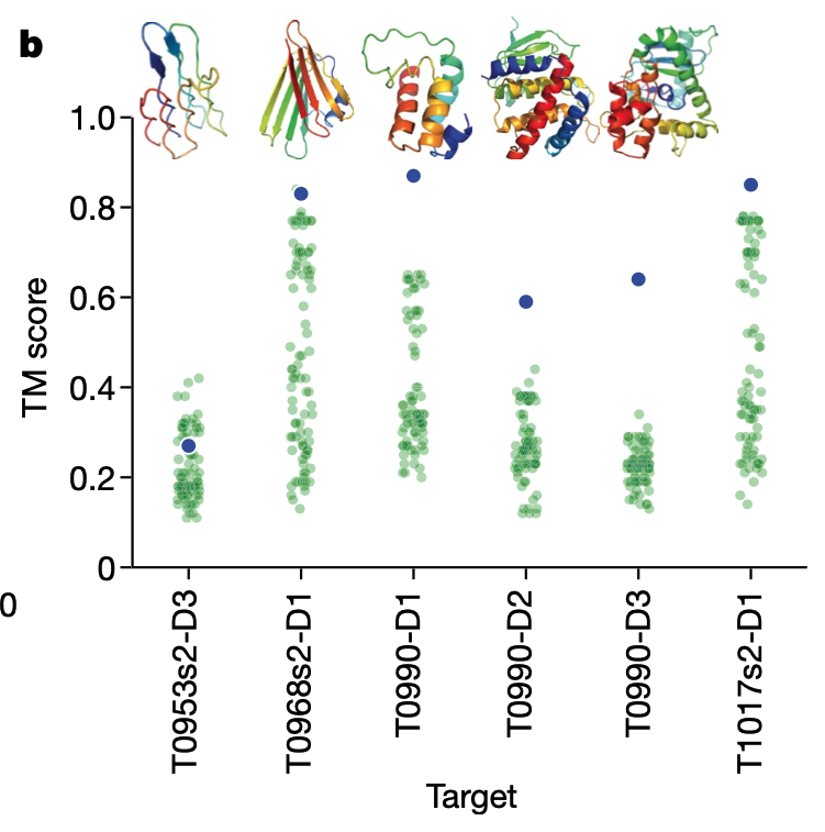 AlphaFoldではテンプレートを使用せず、FM手法のみを使用しているにもかかわらずTBMカテゴリでも高いスコアを獲得し(Fig.1b)、トップ1モデルでは4位、ベスト5モデルでは1位となりました。