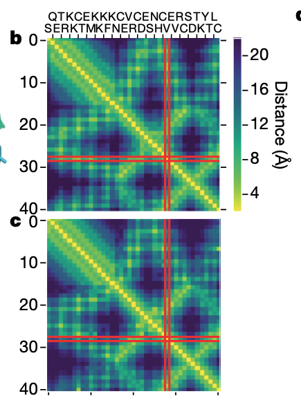 従来では「接触」について2つの残基のβ-炭素原子が互いに8Å以内にあるかないかのバイナリで表現していたそうです。しかしAlphaFoldではもっと細かい予測を行っています。Methodsのところに書かれていたのですが、コンタクトマップを作成するときは、2Å ~ 22Åを64分割したbinに分けて、そのクラスを予測する設計にしているそうです。
