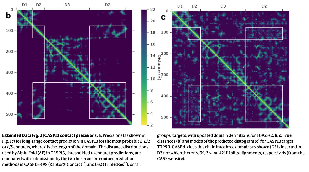AlphaFoldでは相同配列が少ない場合でも高い精度を出した。 CASP13ではブラインドアセスメントにおいてフリーモデルドメインで43問のうち24個において高い精度を出した(TMスコアが0.7以上であった)。同大会で第2位の精度を出した方法ではサンプリング&コンタクト情報を用いた手法で43問のうち14問において高い精度を出していた。