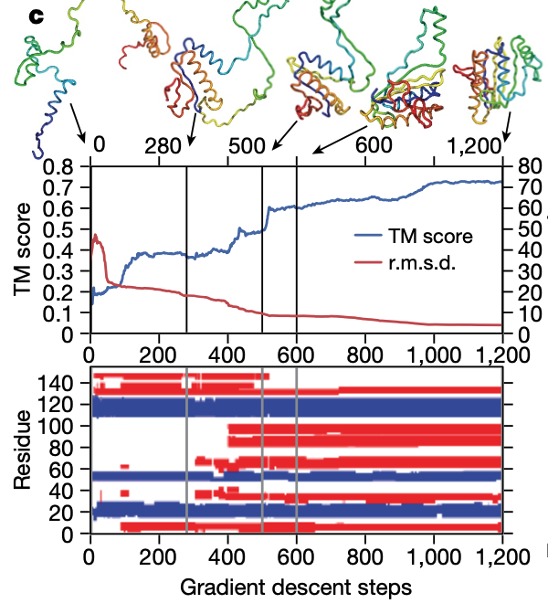 第一ステップで構築されたコンタクトマップをもとに構築されたポテンシャルを最小化する構造を実現する。 理想的なタンパク質バックボーン形状の微分可能なモデルを作成し、バックボーン原子座標をねじれ角(φ,ψ)の関数として与える:x = G(φ,ψ)