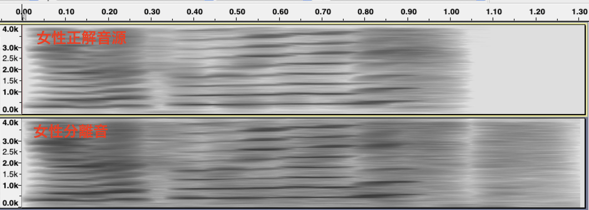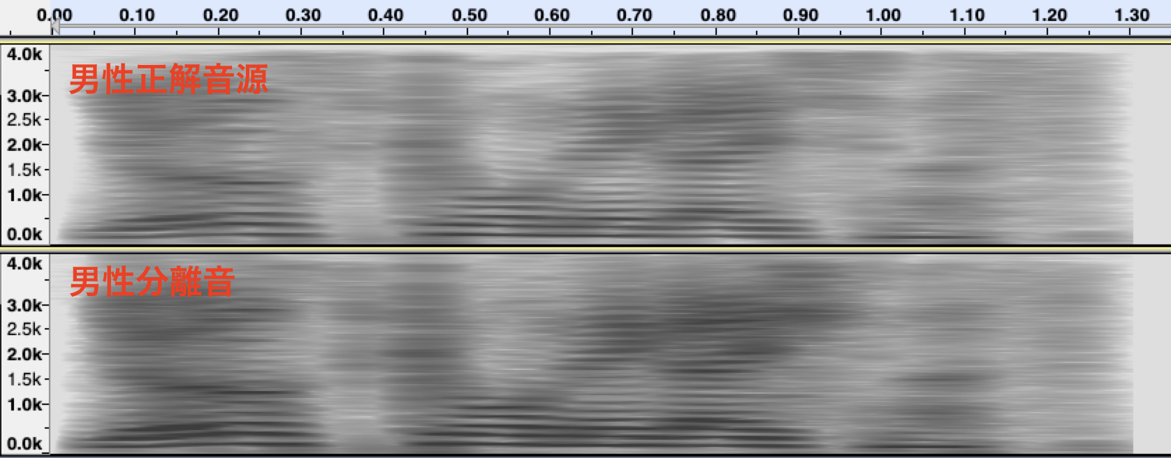 他にも、私の声で、異なる発話パターンを重ね合わせた混合音の分離を試してみました。結果は、芳しくなく、これは、音声の特徴が似た発話が重なると分離できないことを示しています。SepFormerを含め音声の特徴で分離する手法は、このパターンの分離が困難です。しかし、単一チャネルの音源分離を同様に人間が行った場合に、聴き比べられるかというと、とても難しい課題だと思います。