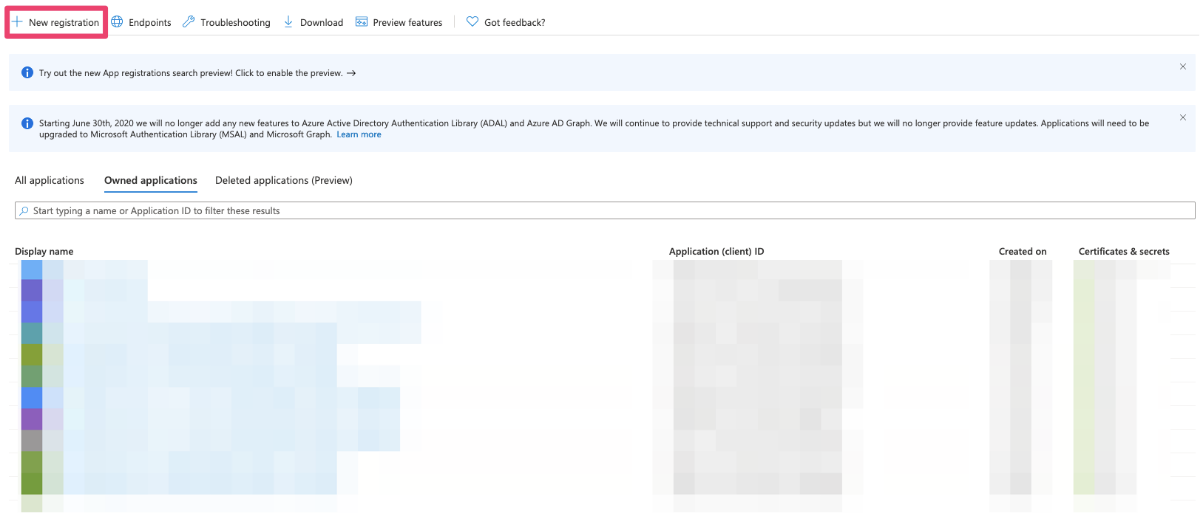 Azure Portalにログインし、Azure Active Directory→App registrationsへ移動します。