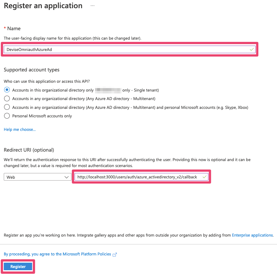 NameおよびRedirect URIを入力します。Redirect URIは http://localhost:3000/users/auth/azure_activedirectory_v2/callback とします。