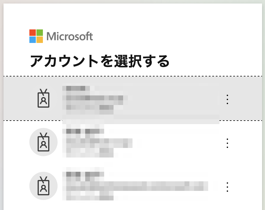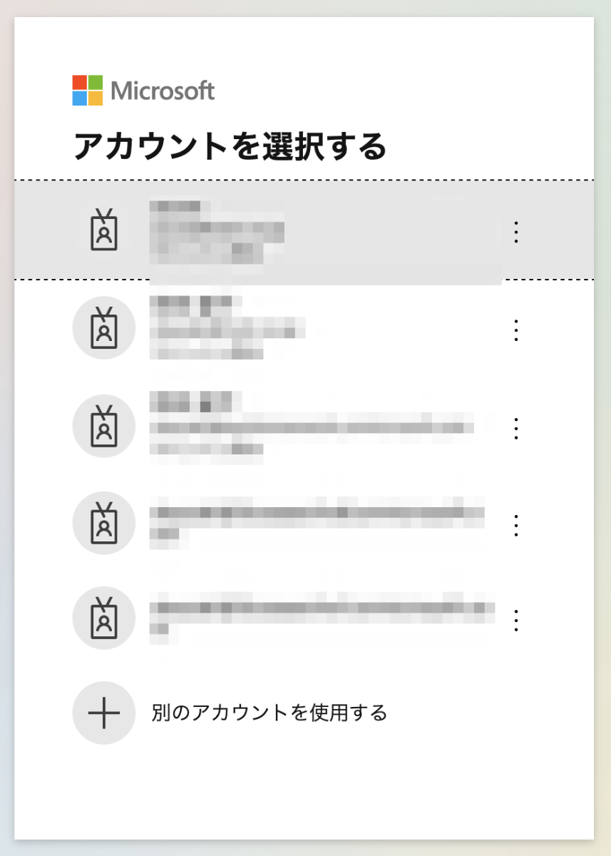 Microsoftのログイン画面が表示されます。使用するテナントに属するアカウントを選択しログインしましょう。