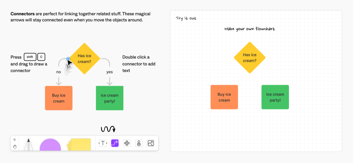 オブジェクト同士をつなぐ矢印機能もオンラインホワイトボードではお馴染みですが、線の中央にテキストを挿入できるのが便利ですね。