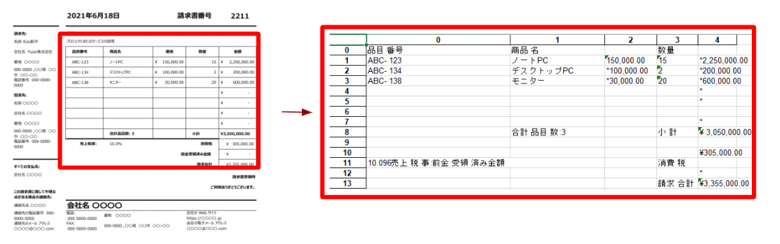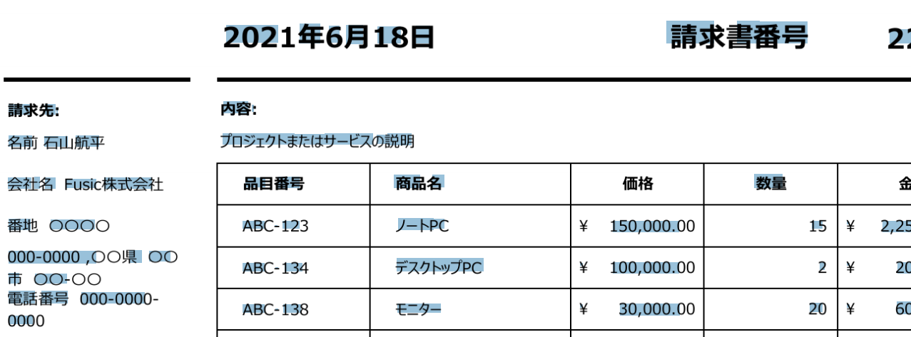 今回は自作した架空の請求書の画像データを用いています。画像の通り、うまく表の情報を抽出できていることがわかります。