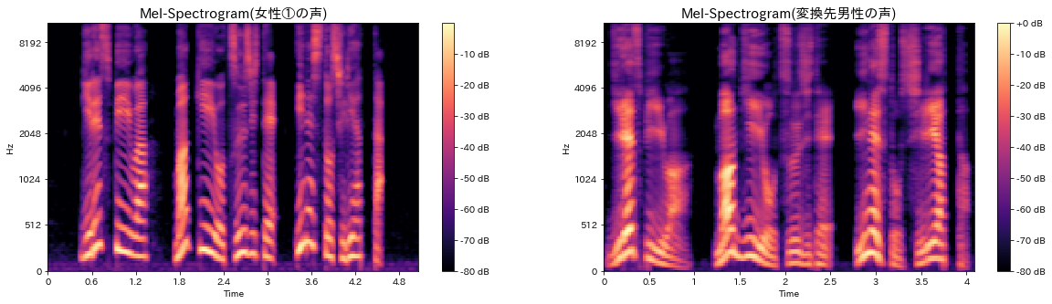 最終的にモデル②で変換した声を、またモデル①で変換先男性の声に変換してみました。