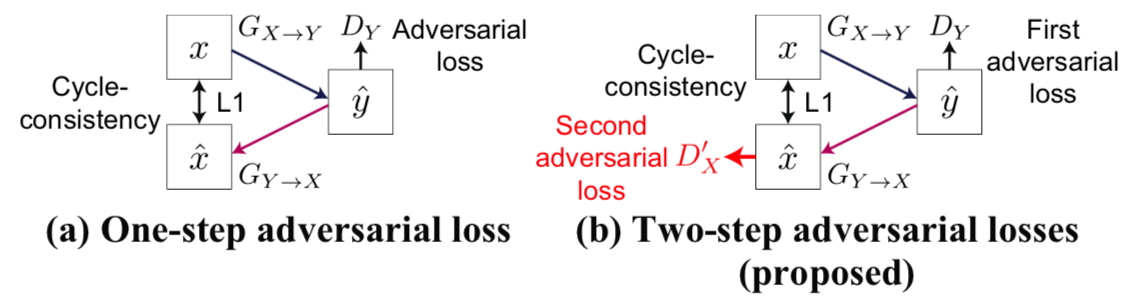 CycleGANモデルで大事なことは、Cycle Consistencyを維持することです。普通のCycleGANでは下図(論文中Fig.1)の(a)One-step adversarial lossの形で、変換先から戻ってきた結果とオリジナルデータのL1 lossを取ることで、その一貫性を維持します。