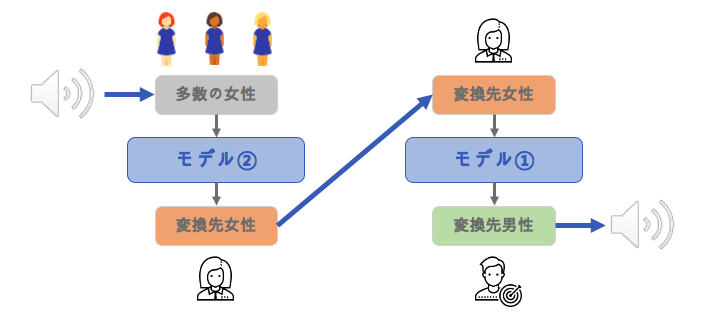 - 2つのモデル(「多数の女性→変換先女性」 と 「変換先女性→変換先男性」の音声変換)を学習させ、多数の女性の声を変換先男性の声に変える実験を行ってみました。その構造は下図になります。