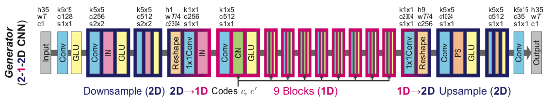 StarGAN VC②のGenerator構造は、CycleGAN VCでも使われていた2-1-2D CNNの構造に、CINを採用した形をしています。上図から、縮約された音声特徴の変換プロセス(9個のResidual Layers)の中にCIN層が入っていることが確認出来ます。これを通じ、入力音声情報の特徴を維持しながら、各Domainへの特徴変換を学習しようとしてます。