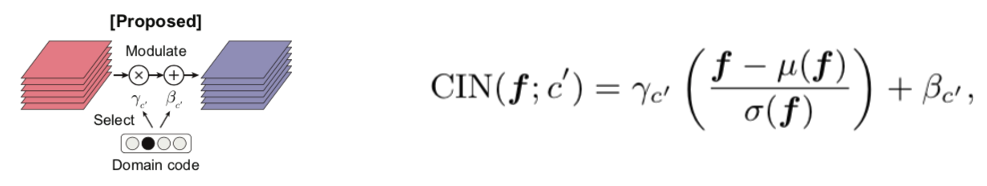 γsとβsは、各ターゲットDomainに相当する学習パラメーターで、入力(x)のスケーリングと移動を行います。Domain特徴によって、各パラメーターは別の最適化を行い、一つの入力(x)に対して様々な出力(z)を生成します。このようにCINは、数少ないパラメーターで、1対多変換学習に対応するというメリットがあります。