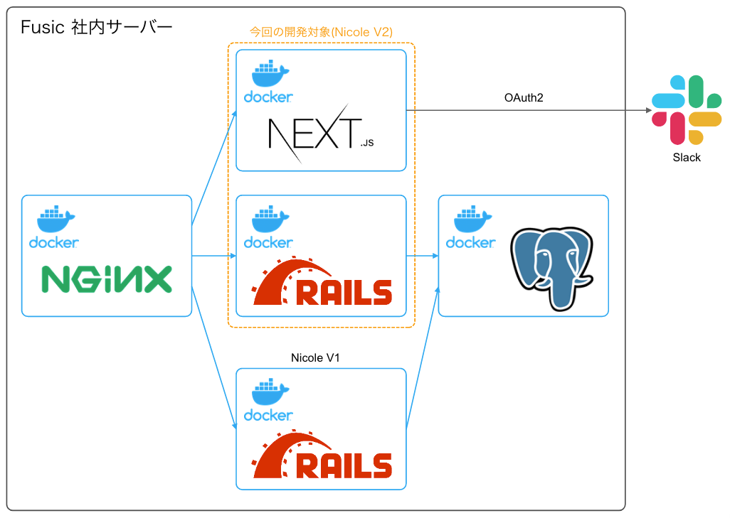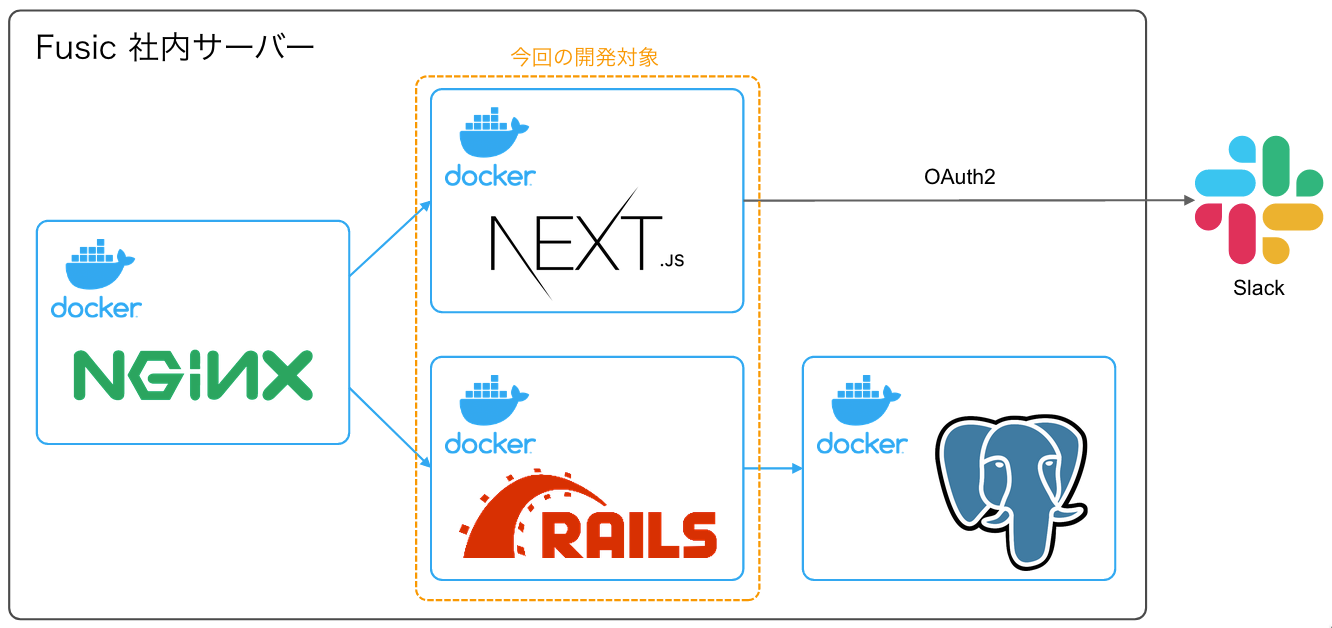 このシステムは元々Docker上で運用されていたのですが、1つのコンテナ上でRailsが起動しているシンプルな構成でした。フロントエンドとバックエンドを分離することに伴い、コンテナも分離することにしました。