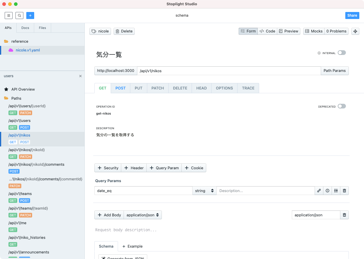 OpenAPI自体は有用だったのですが、スキーマを自分で記述するのはそれなりに大変ですし、記述漏れがあっても気づけないといった問題も抱えています。そこで今回は、Stoplight Studioというツールを使ってスキーマを記述しました。