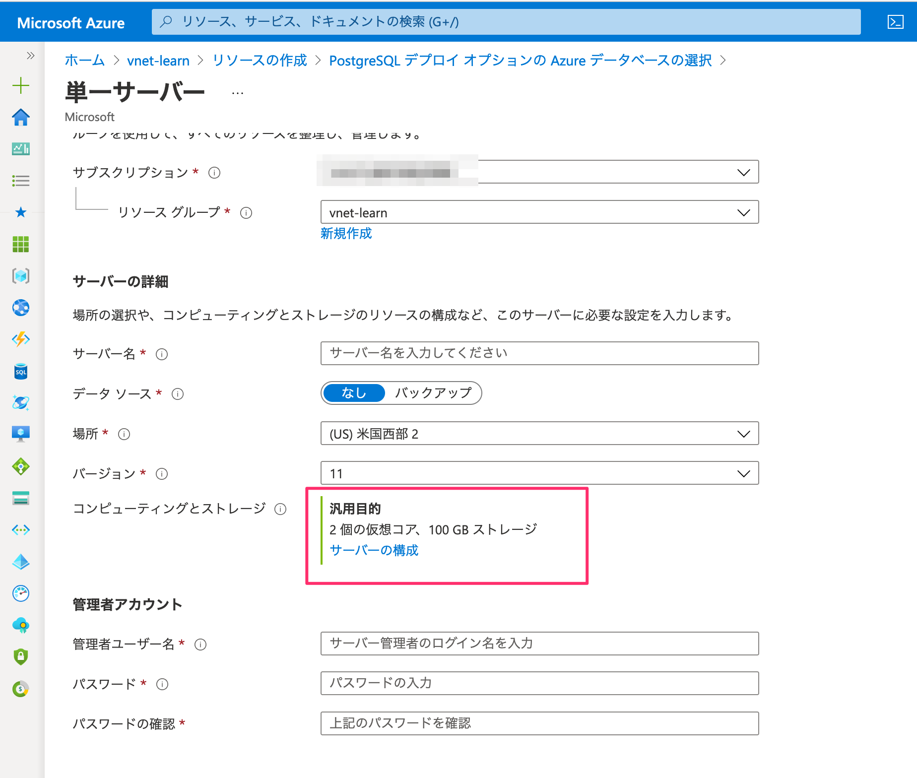 リソースの作成>Azure Database for Postgres>単一サーバー