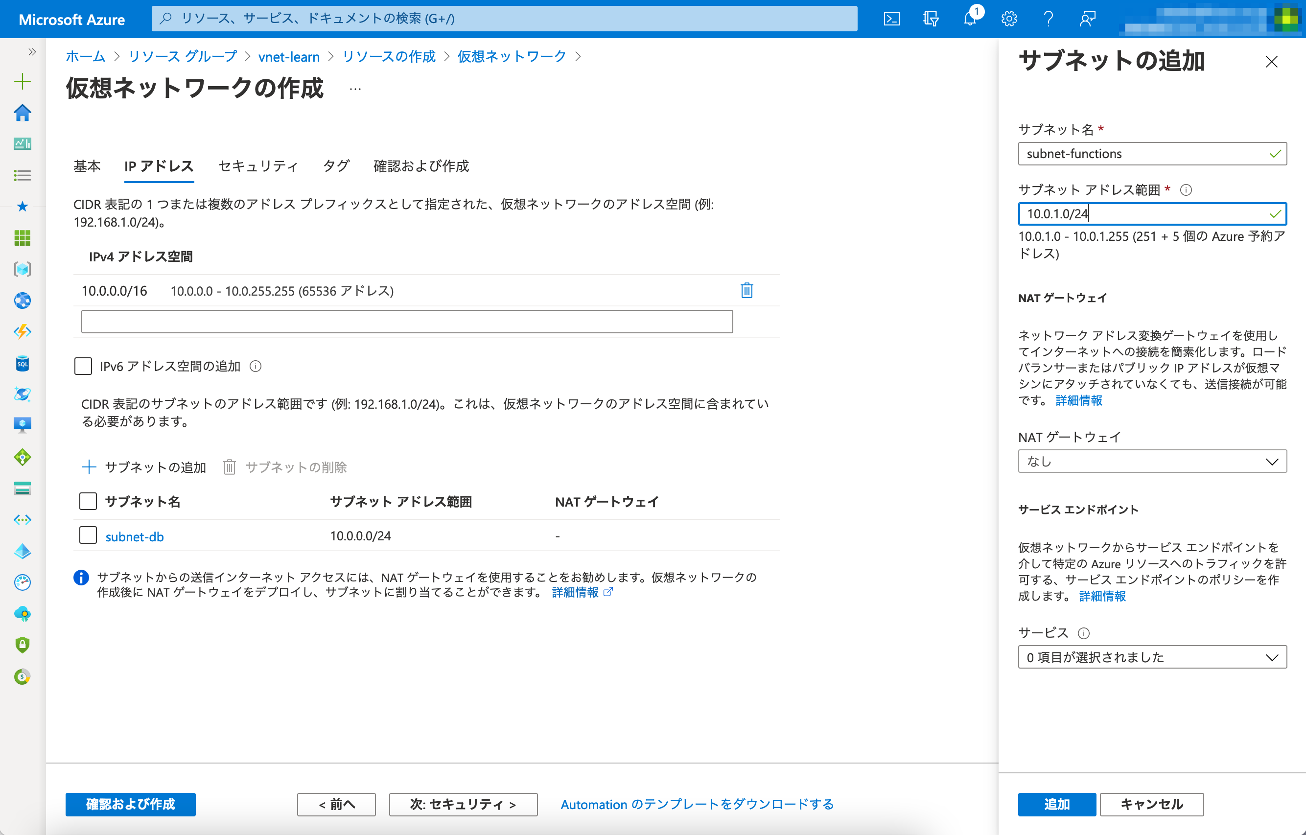 Functions を受けるサブネットと、DB にアクセスするプライベートエンドポイント用のサブネットです。