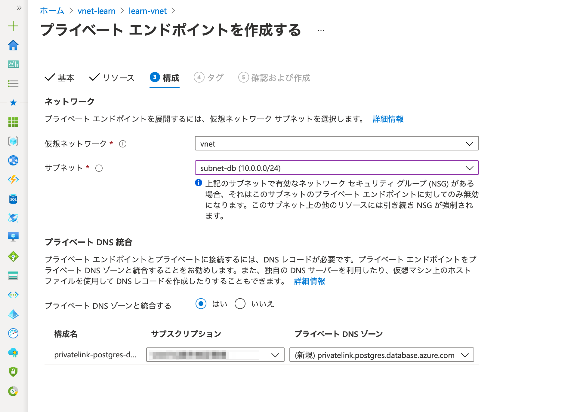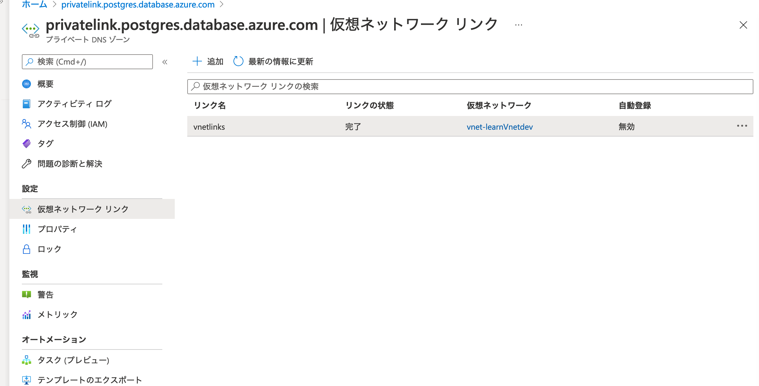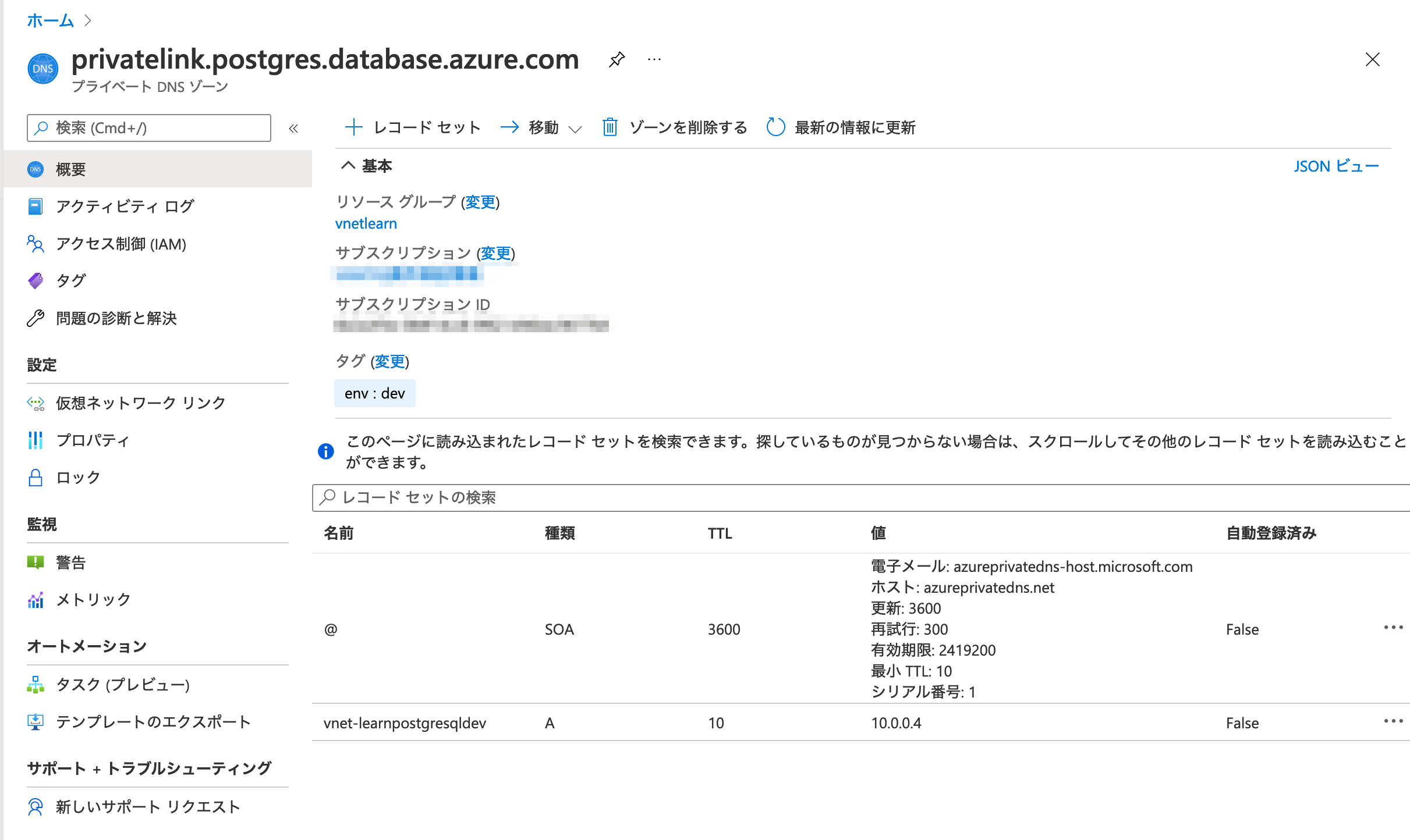DNS ゾーン作成> privatelink.postgres.database.azure.com という名前で作成。