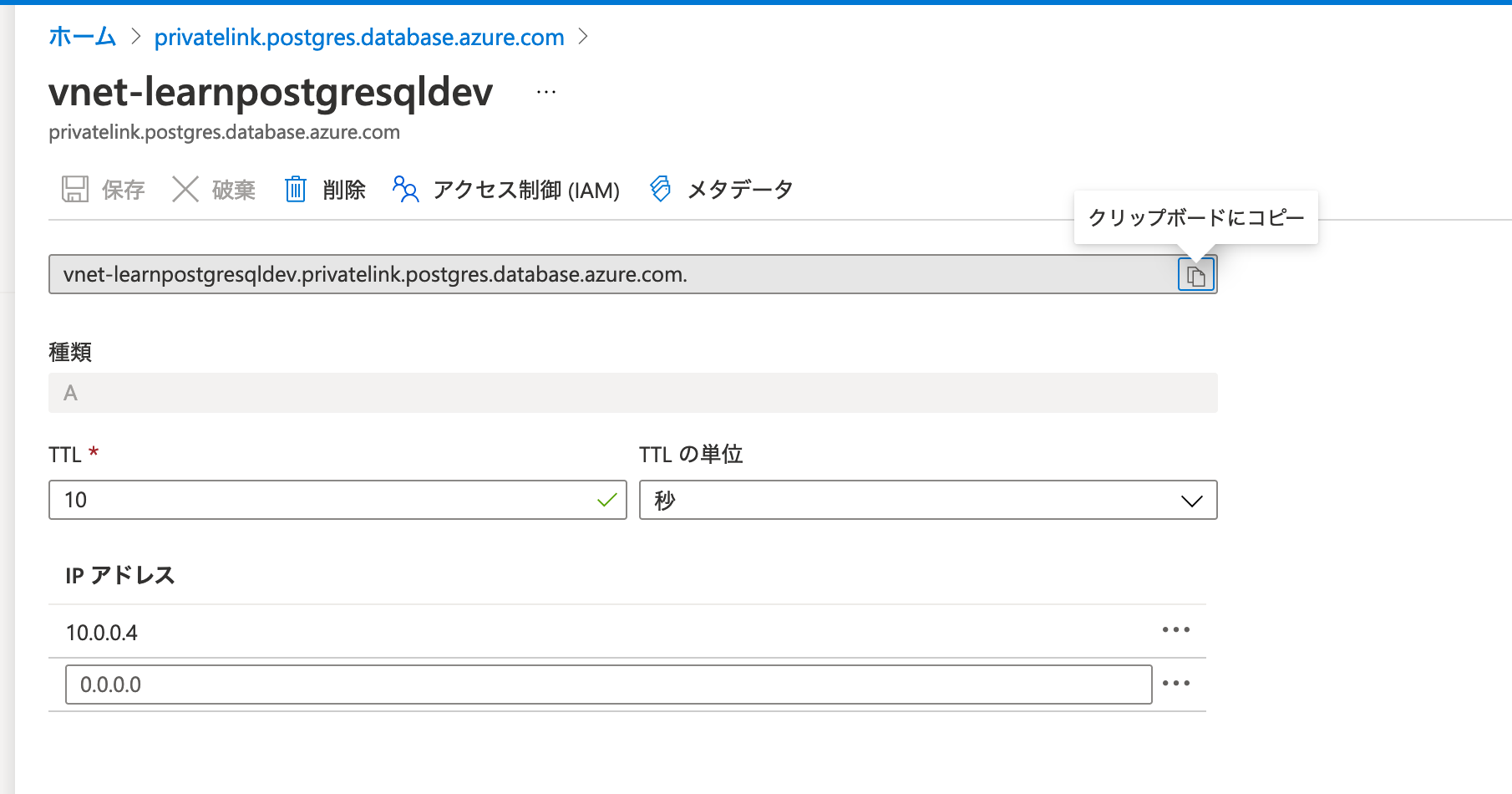Aレコード名+プライベートDNSゾーン名がFQDNになります。
