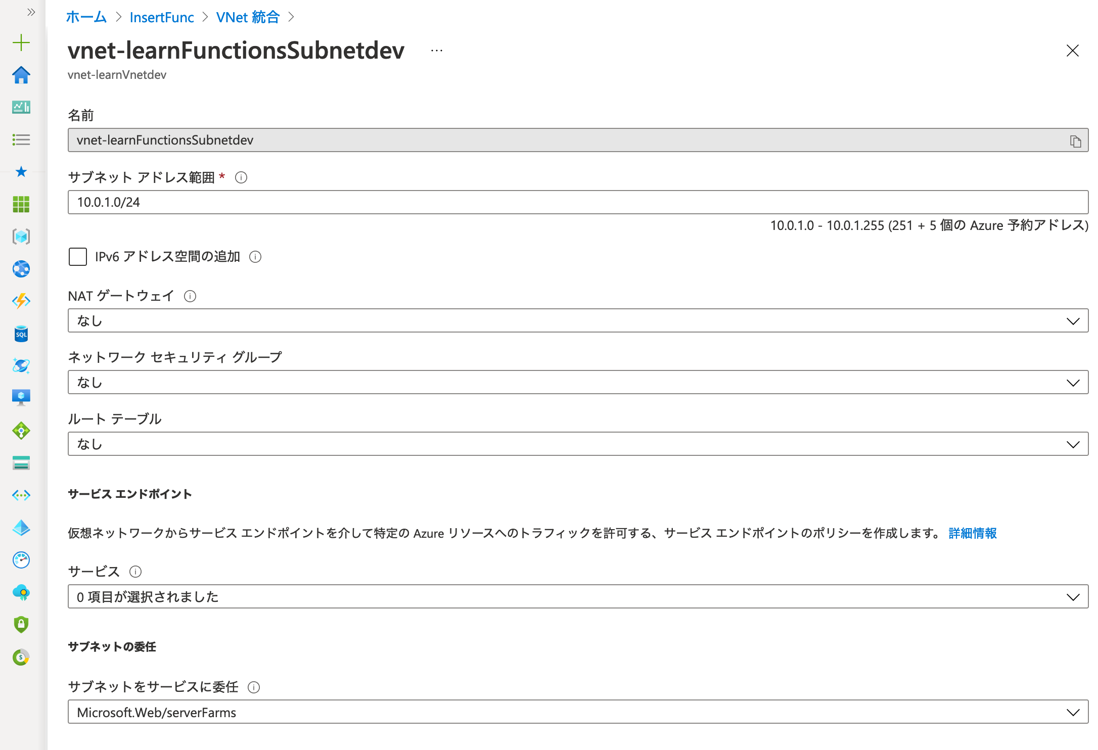 | サブネットの委任 | Microsoft.Web/serverFarms |