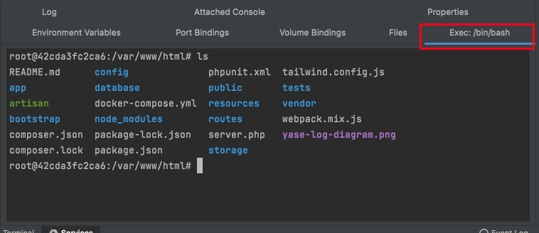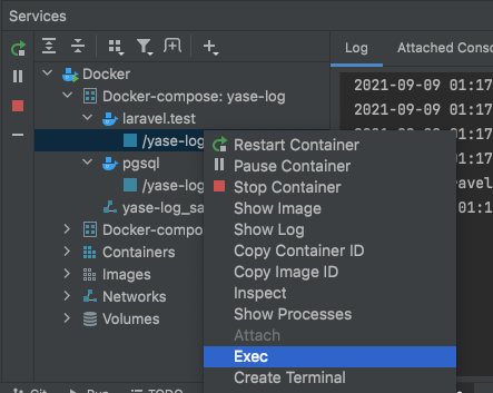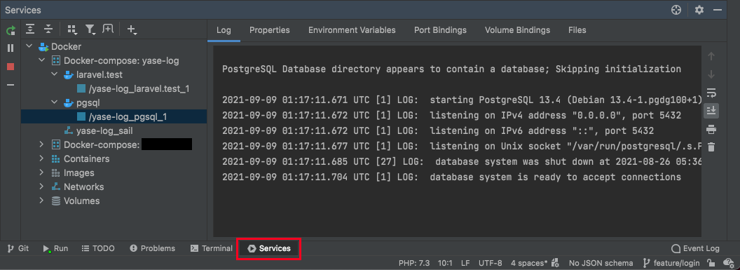 PhpStormではサービスツールウィンドウにコンテナに関する情報を確認できます。表示されるのは以下の6つです。
