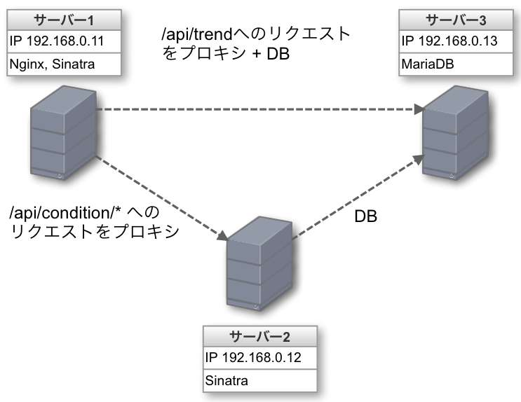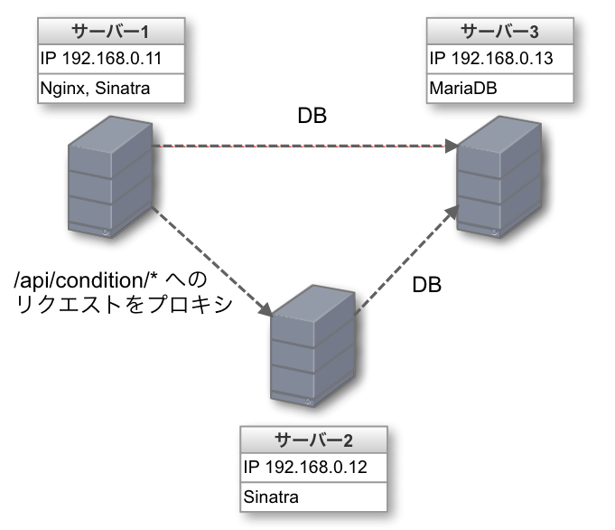 サーバー2を /api/condition/* へのPOST処理、サーバー3をDB専任としています。