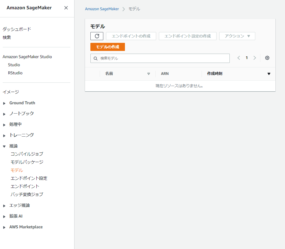 以上で ECR に登録出来たら、次は SageMaker でモデルの登録を行います。Amazon SageMaker のページに移動し、左のメニューから「推論/モデル」を選択します。モデル一覧が表示される画面に移動するので、上の「モデルの作成」ボタンを押します。