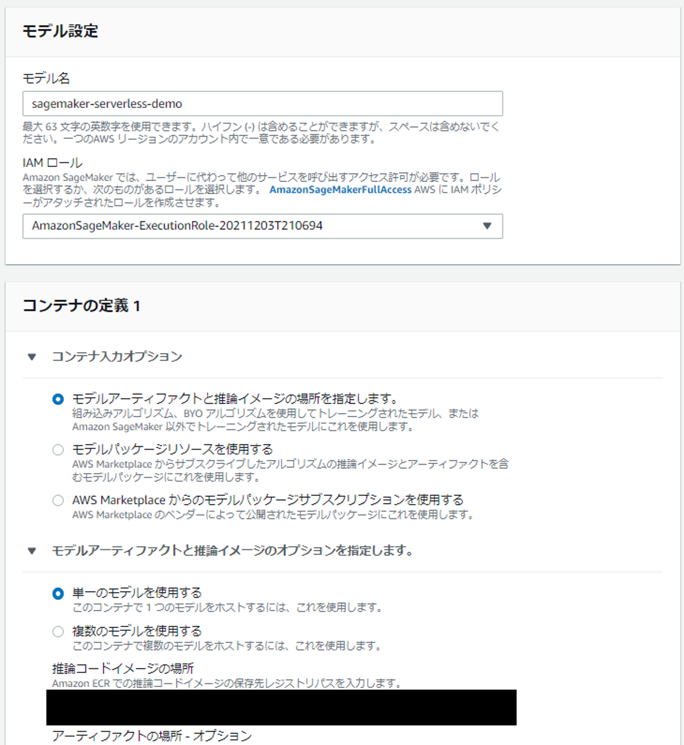 モデル名や IAM ロールは適宜付与してください。今回は sagemaker-serverless-demo という名前にし、新しく IAM ロールを作成、付与しました。