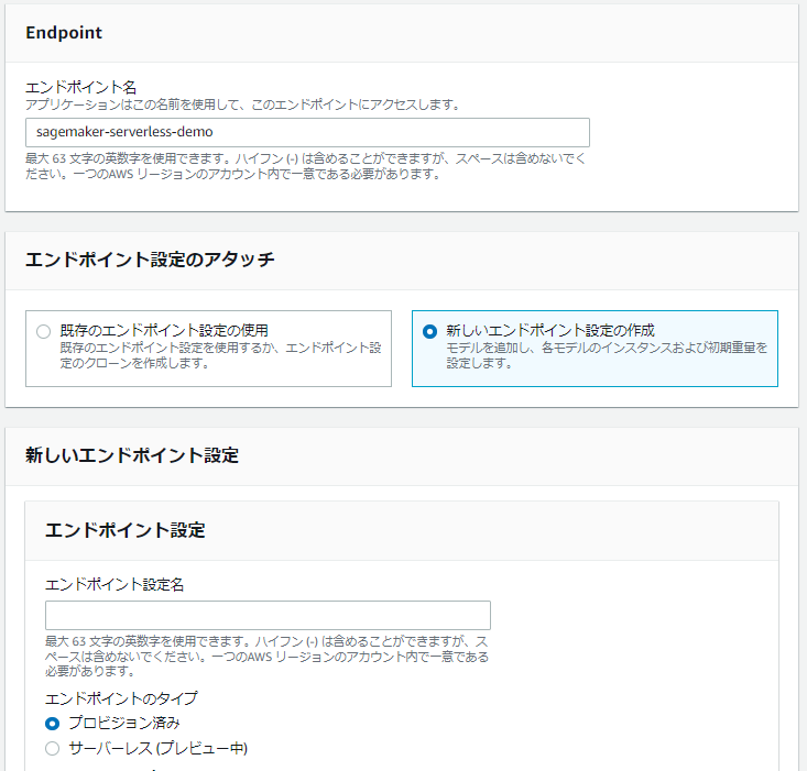 「エンドポイント名」は好きな名前を付けてください。今回は sagemaker-serverless-demo という名前にしました。「エンドポイント設定のアタッチ」で「新しいエンドポイント設定の作成」を選択すると、新しいエンドポイント設定が行える画面が下に出てきます。「エンドポイント設定名」は好きな名前を付けてください。今回は sagemaker-serverless-demo という名前にしました。その下の「エンドポイントのタイプ」で「サーバレス(プレビュー中)」を選択してください。それから、「本番稼働用バリアント」で先ほど登録したモデルを選択しましょう。このモデル追加の画面で、メモリサイズや最大同時実行数を変更できます。モデルを追加した後、「エンドポイント設定の作成」ボタンを押すとエンドポイント設定が作成できます。その後、下の「エンドポイントの作成」ボタンを押すとエンドポイントが出来ます。ステータスが Creating から InService に変わると使用できるようになります(5~10 分かかると思います)