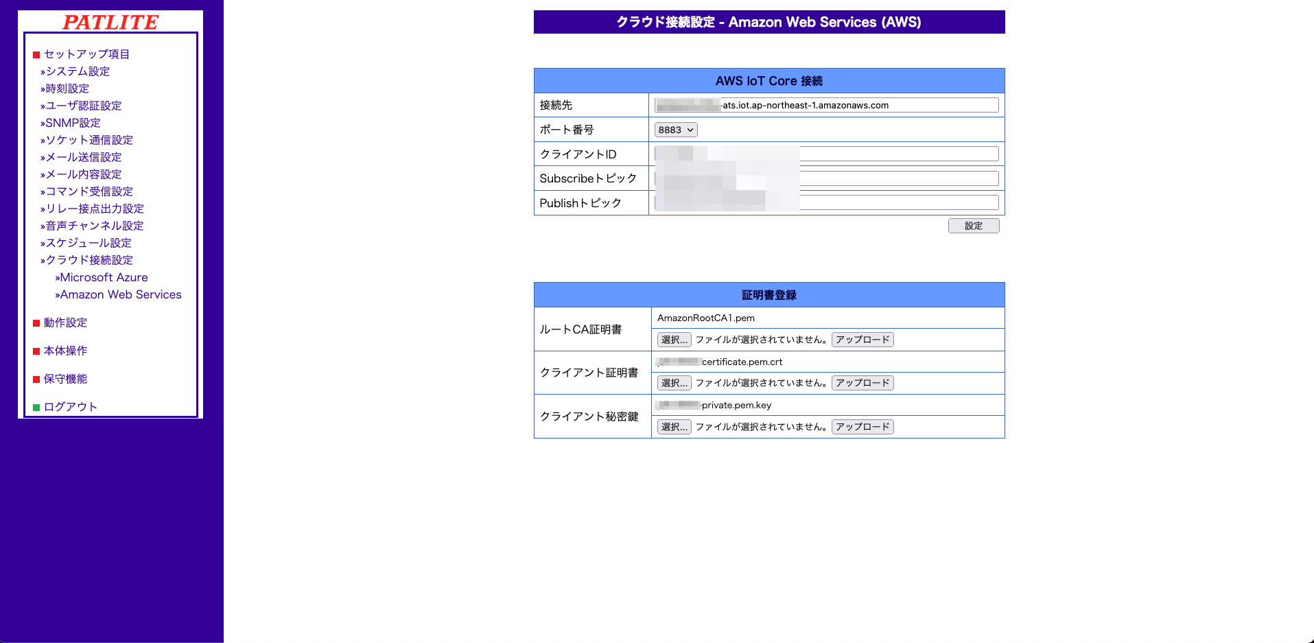 セットアップ項目→クラウド接続設定→Amazon Web Servicesより、AWS IoT CoreのエンドポイントやTopicの設定、X509証明書のアップロードが可能です。