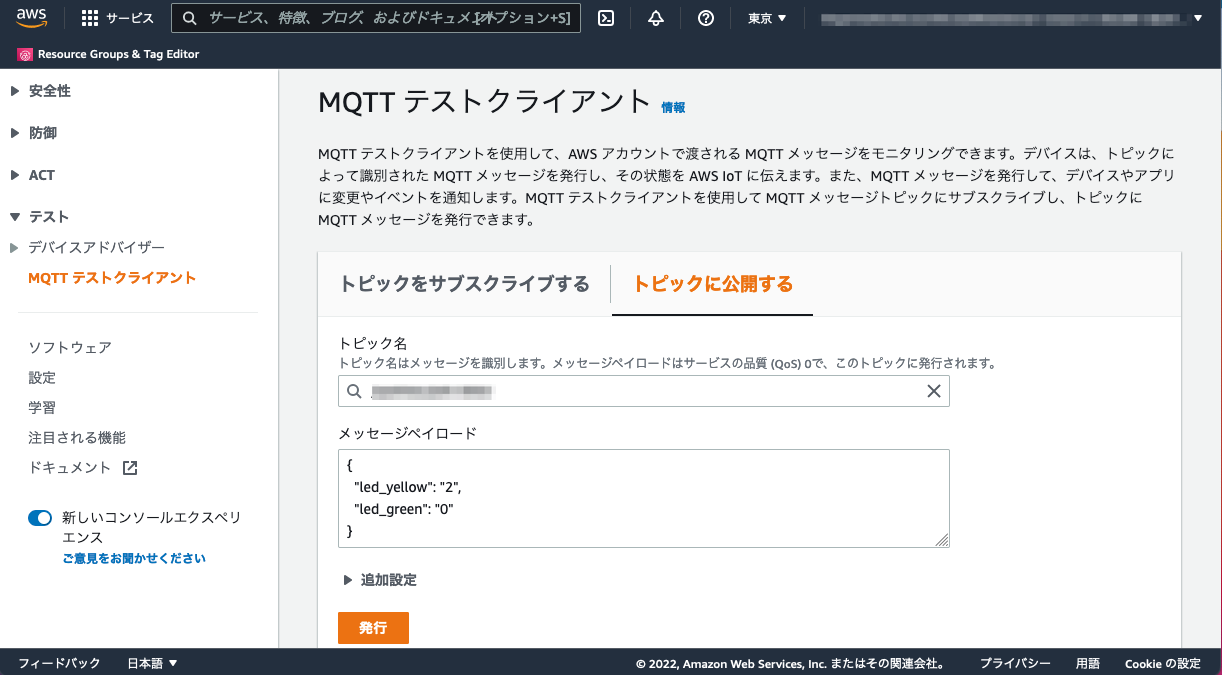 設定が完了したらAWS IoT CoreのMQTT テストクライアントを開いて、パトライトがSubscribeしているTopicに以下のようなJSONを送信します。