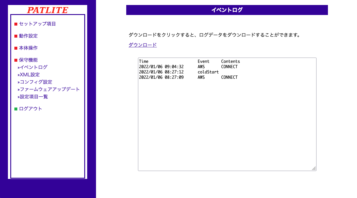 設定が完了したら、保守機能→イベントログを開いて、AWSとの接続ができていることを確認します。