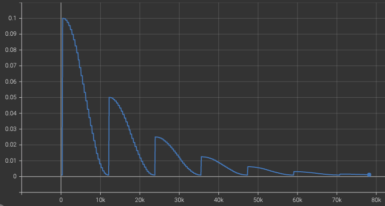 Bag of Tricks for Image Classification with Convolutional Neural Networks論文で良い精度を見せてくれたスケジューラーで、CyclicLR・CosineAnnealingLR・Warmupなどを組み合わせたものです。経験上、分類モデルの学習で安定的なパフォーマンスを出してると思いましたので、今回実験では上図のようなLearning Rateで学習を行いました。