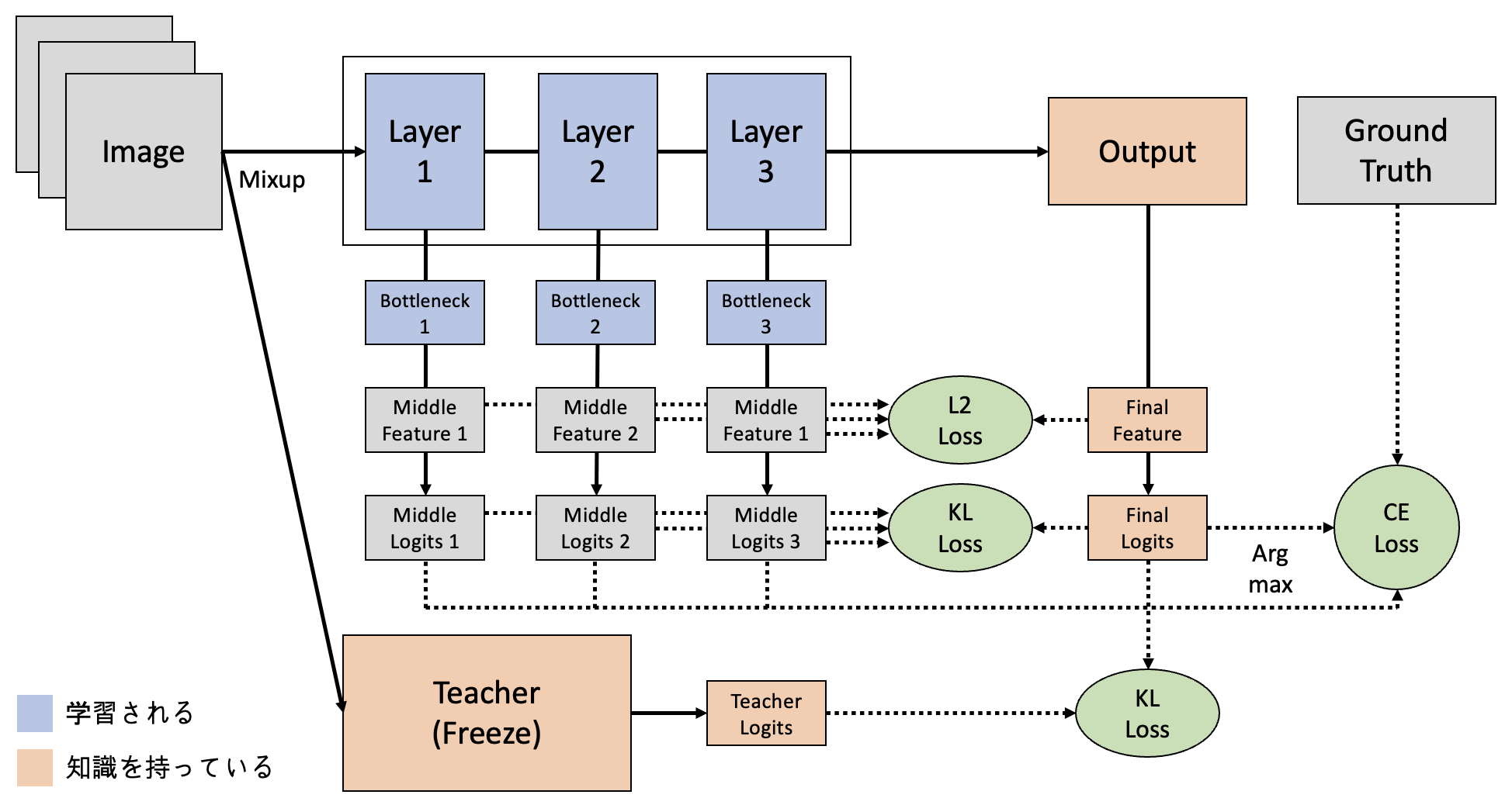- Self Distillationを通じ、Studentモデルの最終レイヤー知識を中間層で学習